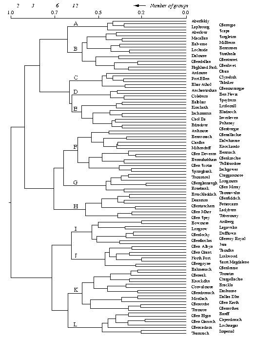 Fig. 1. Dendrogram representing the minimum variance hierarchical classification of single-malt Scotch whiskies: two scales are provided at the top of the graph - the number of groups formed by cutting the dendrogram vertically at the given points and the fusion distances of the hierarchical classification (represented by vertical segments in the dendrogram); the vertical order of the whiskies is partly arbitrary - swapping the branches of a dendrogram does not change the corresponding cophenetic matrix (the 12 groups detailed in Appendix A are labelled A-L here)