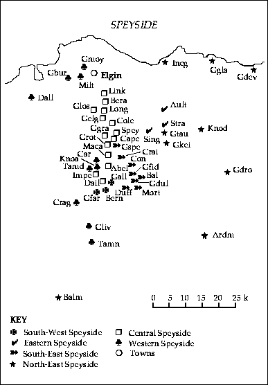 Fig. 3. Map of the Speyside region showing six of the 11 groups (symbols) of Scotch distilleries of the regional classification of single-malt whiskies (Appendix B) (the names of regions and of some major cities are also indicated) and abbreviations and full names of the distilleries