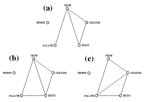 Abef Aberfeldy Galb Glen Albyn Jura Jura Abel Aberlour Gall Glenallachie Kinc Kinclaith Ardb Ardberg Gbur Glenburgie Knoc Knockando Ardm Ardmore Gcad Glencadam Knod Knockdhu Auch Auchentoshan Gdev Glen Deveron Lady Ladyburn Ault Aultmore Gdro Glendronach Laga Lagavulin Balb Balblair Gdul Glendullan Laph Laphroaig Balm Balmenach Gelg Glen Elgin Link Linkwood Balv Balvenie Gesk Glenesk Litt Littlemill Banf Banff Gfar Glenfarclas Locn Lochnagar Benn Ben Nevis Gfid Glenfiddich Locs Lochside Bera Benriach Ggar Glen Garioch Long Longmorn Bern Benrinnes Ggla Glenglasshaugh Maca Macallan Benr Benromach Ggoy Glengoyne Mill Millburn Blad Bladnoch Ggra Glen Grant Milt Miltonduff Blai Blair Athol Gkei Glen Keith Mort Mortlach Bowm Bowmore Gkin Glenkinchie Nort North Port Brac Brackla Gliv Glenlivet Oban Oban Brui Bruichladdich Gloc Glenlochy Port Port Ellen Bunn Bunnahabhain Glos Glenlossie Pult Pulteney Caol Caol Ila Gmho Glen Mhor Rose Rosebank Cape Caperdonich Gmon Glenmorangie Sain Saint Magdalene Card Cardhu Gmoy Glen Moray Scap Scapa Clyn Clynelish Gord Glenordie (Ord) Sing Singleton (Auchroisk) Cole Coleburn Grot Glenrothes Spey Speyburn Conv Convalmore Gsco Glen Scotia Spri Springbank Crag Cragganmore Gspe Glen Spey Stra Strathisla Crai Craigellachie Gtau Glentauchers Tali Talisker Dail Dailuaine Gtur Glenturret Tamd Tamdhu Dall Dallas Dhu Gugi Glenugie Tamn Tamnavulin Dalm Dalmore Gury Glenury Tean Teaninich Dalw Dalwhinnie High Highland Park Tobe Tobermoray Dean Deanston Impe Imperial Toma Tomatin Duff Dufftown Incg Inchgower Tomi Tomintoul Edra Edradour Incm Inchmurrin Torm Tormore Fett Fettercairn Inve Inverleven Tull TullibardineResults of all comparison tests from the raw data tables, distance matrices and dendrograms are presented in Tables 3, 4 and 5 respectively. The significant and nonsignificant results from these three tables are summarized, in Fig. 4, by graphs connecting the significantly related (i.e. the not statistically different) feature types. We can see from these results that the finish characteristics are always left unconnected and so differ from all other features, at all three comparison levels (Figs 4(a), 4(b) and 4(c)). Other type comparisons sometimes differ, depending on the test. Four tests are significant when comparing the raw data tables, five tests are significant with distance matrices and five other tests are significant when dealing with cophenetic matrices. Of all these significant results, only three comparisons are congruent at all levels: palate-nose; nose-colour; colour-body. The colour-palate relationship is only significant when comparing cophenetic matrices, whereas the nose-body test was not found significant with dendrograms, even though it was significant with raw data tables and distance matrices. However the body-palate tests were significant when dealing with raw data or distances, but not when comparing dendrograms. Differences in statistical methods and/or transformation of data from one level to another must be responsible for discrepancies in some of these results; some information is lost when moving from raw data to a distance matrix using one particular distance function, and information is lost again along the path from distances to dendrogram, at which point the ultrametric property is acquired.