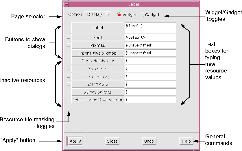 The four buttons at the bottom of the panel offer general commands. "Apply" causes your new resource settings to take effect. If you do not click "Apply", your edited settings are lost when you select another widget or close the resource panel. 3.2.4 Undo, Close, Help