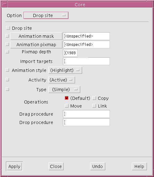 This is where you can specify a drop site. A drop site is a widget that is prepared to receive certain types of data from other widgets by means of the drag and drop mechanism introduced in Motif 1.2. Drag and drop allows you to pass information between widgets by selecting the data and dragging it using the mouse.