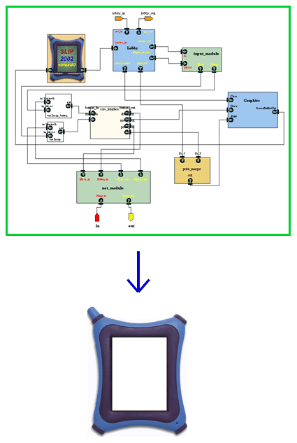 This page explains how a virtual wireless network of game machines is created within the same copy of VCC. Firstly, the VCC behaviour for one game machine must be stored in a symbol. This is shown in the following diagram. Click here for a larger view of the behaviour. Now several instances of the game machine symbol can be created and connected together by their external ports. This forms the simulated wireless network, as shown below. The net and lobby in and out ports of each machine are connected to every other machine on the network. This means that when a message is sent, it will go to every machine on the network. lobby_merger and net_merger blocks are used to merge the outputs from 2 machines.