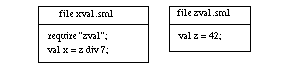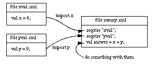 Note: A file may use declarations from files it imports with require, but this relation is not transitive. Suppose you change xval.sml to require another file, zval.sml, to compute its value of x: