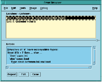 The error browser has two windows. The top window shows a list of the errors that have been encountered. Any of these may be selected, and the bottom window shows more details, if any are available, of the selected error. In this case, the error browser is initially showing details of the type clash it has detected, including what the two different types are that it cannot unify. If we select the other error in the top window ('Unbound value b'), there is no more to say about it, and the error browser simply repeats this information in the lower window.