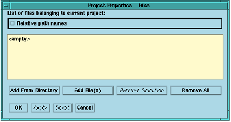 To begin with we need to specify the required files for the project. This tells the project manager where the target source files for the project are located. Click on Files. The "Project Properties - Files" dialog appears.