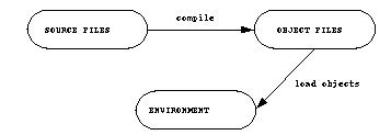 The MLWorks compilation system converts between source files, object files, and loaded objects in the interactive environment as shown in Figure 2.8.