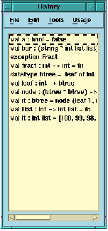 Note that the history tool has an effect on garbage collection. If you evaluate expressions that have extremely large return values (for example, proofs) and bind these return values to it, say, then when you rebind it, the values are not garbage collected; instead they are added to the history tool list. Values are only garbage collected when they drop off the end of the history list. Memory can be reclaimed in these instances by explicitly emptying the history list using Edit > Delete All or removing duplicate values using Usage > Remove Duplicates.