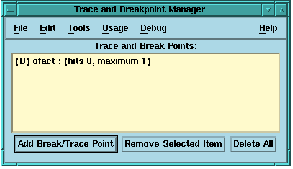The breakpoint manager allows you to specify a number of function names. Whenever one of these function names is called, MLWorks enters the stack browser. To specify a break point, click on Add Break/Trace Point and type the function name into the Name text box and click OK or Apply. The function must have been compiled in debug mode for the breakpoint to take effect.